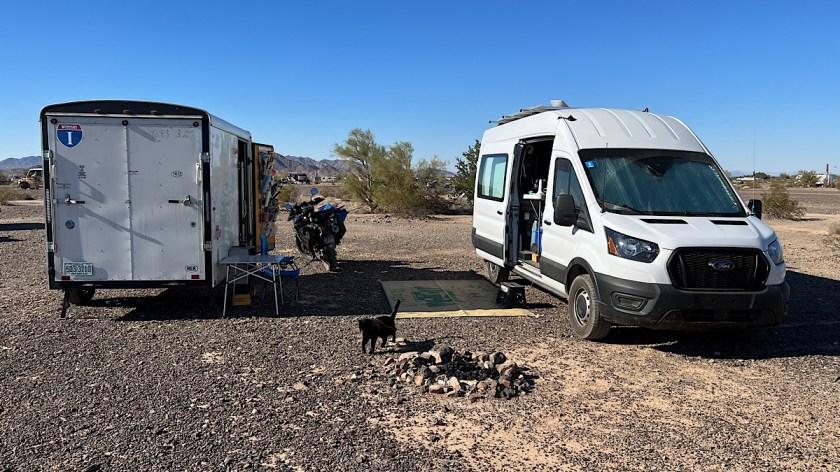 Yesterday I was stuck inside the van all day through a wind storm. It wouldn’t be Quartzsite without them. I managed to partially break down camp and toss things in the trailer, like my shade cloth, before they got blown away. My rug is staked down, so that got to stay out. While annoying, I’d rather deal with that than extreme cold, and unlike snow, you don’t have to shovel it afterward. So not a lot went on yesterday. Even the Meet in Q Halloween party was postponed from last night until tonight as a result. Ironically, this means I could’ve taken my time getting here and gotten my costume in time after all, but nobody knew it was going to work out that way. My costume is simple, and something that strikes fear and terror into any vehicle dweller: a check engine light.