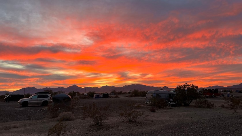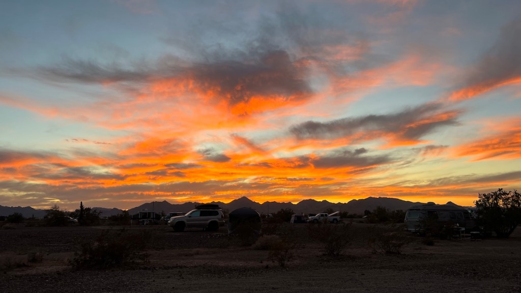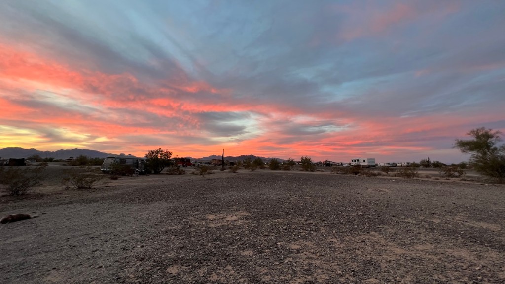 What these clouds aren’t good for, however, is my solar charging. Yesterday morning I woke up and saw it was overcast again. I checked my voltage, and it was down close to danger levels. I’ve gotten so spoiled by the virtually unlimited sun that I’ve been leaving Starlink on all day and evening, with no problems at all — until now. I was about to set up my generator for the first time in Quartzsite, then decided that since I’d just printed out a whole bunch of paperwork on Monday, I’d instead drive to Parker to deal with it and recharge off the alternator in the process.