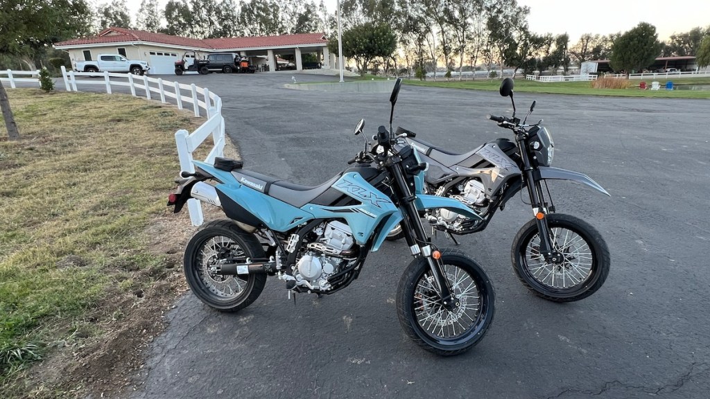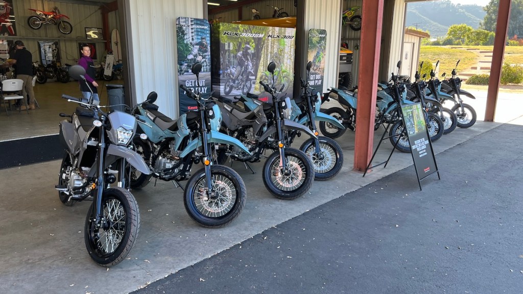 I took advantage of a bagel and a carefully calculated amount of coffee — enough to wake me up and keep me warm, but not so much that I would need a bathroom during an inconvenient part of the day’s rides. They gave us a short presentation about the motorcycles and laid out the schedule for the day. We’d spend the morning riding the standard KLX300 on mixed surfaces, mainly dirt. We’d return to the ranch for lunch, then spend the afternoon on the KLX300SM, the street-focused “supermoto” version of the same bike. Then we geared up, chose one of the fleet of identical neon green motorcycles to ride, and headed for a small motocross track on the property.