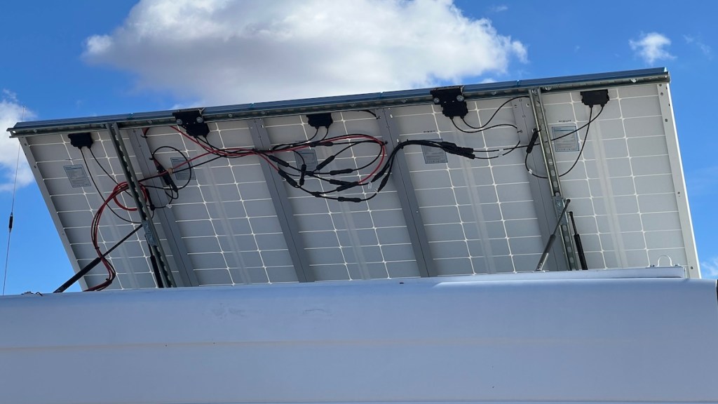 Looks like those solar panels could tip either direction. Which is what I absolutely want for mine. One direction to aim them is fine in the desert, alone. But if you’re on the beach in Mexico at a group rally, you can’t always pick the direction you face.