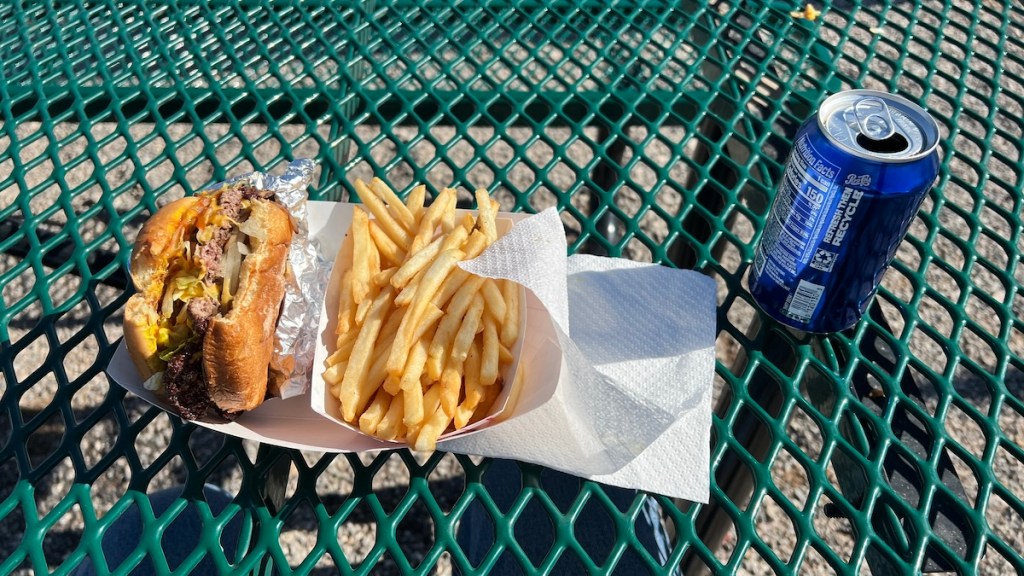 I hopped on the bike and braved the crowds in Quartzsite to run a few basic errands. I put my superior maneuverability to good use and snuck into not really a parking space at Tyson Wells, where I hit the used food store (discount grocery tent) for a few cheap essentials. One of my personal rules is to never go grocery shopping on an empty stomach, so I went back to Wings on Wheels for a delicious Smashburger first. It’s the best burger in town.