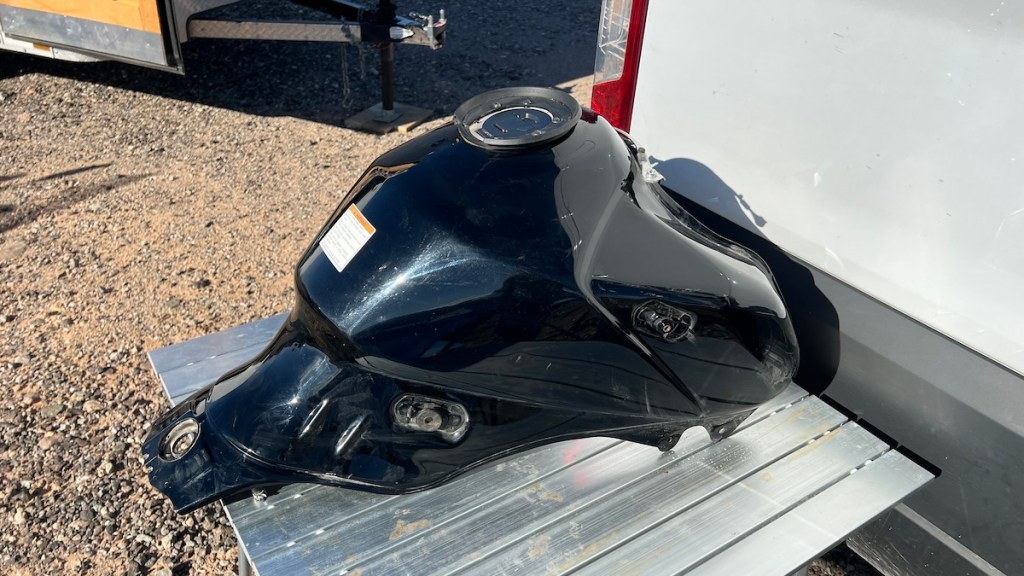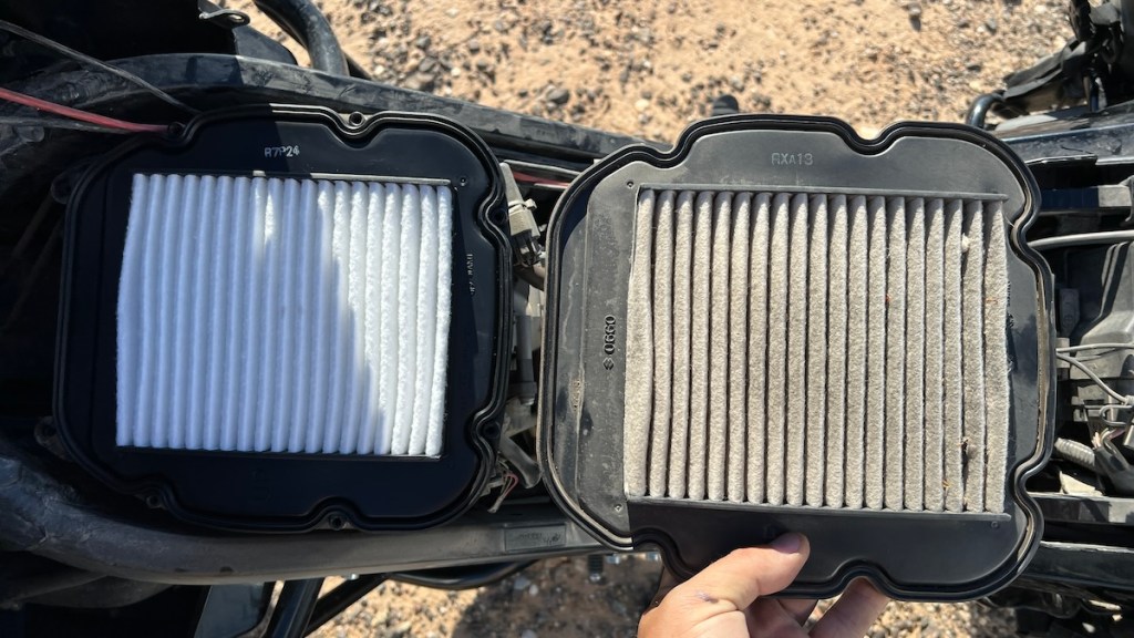 Back at camp, I decided to install the new air filter I got for my bike. The airbox lives under the gas tank, so I had to take it off to get to the filter. At first, the job intimidated me, but I found a YouTube video that showed each and every step involved, which made it easy. I’m used to working with carbureted bikes, and the V-Strom is fuel-injected. This made removing the tank a whole lot easier since I didn’t have to worry about gas pouring out of the tank when I disconnected the fuel line. It definitely needed a new air filter, as you can see from the picture of both of them.