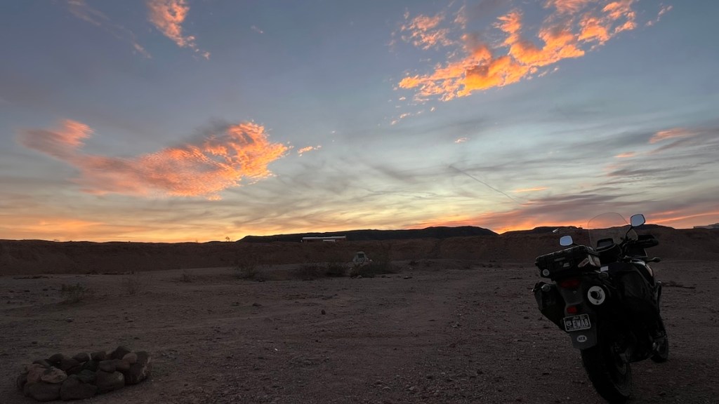Last night’s sunset didn’t start as much but turned into a 360º panorama of spectacular colors. A camera can’t capture the depth of colors, nor what it was like to be completely surrounded by them. It was one of the best Arizona sunsets I’ve ever seen, and that’s a high bar to match. Then we hopped on my bike and went over to the Desert Ratt Pack camp for their campfire gathering. Melissa got to meet some of the voices she heard on the radio, all of whom were quite friendly, encouraging, and helpful toward her efforts to get on the air herself.