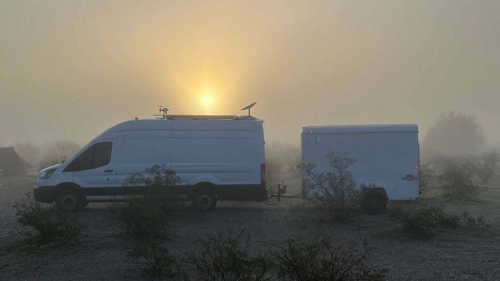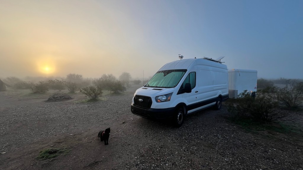 I woke up to the strangest sight, a dense fog over the desert. Deserts are typically dry, but with all the rain and temperatures down near freezing, the relative humidity was high, causing the fog. It looked like a completely different world than I’d arrived at the previous day. I took some photo and video opportunities before it burned off, giving Stacey and Kim the opportunity to deploy their solar panels for some much-needed recharging after all the rain this week. We’re all working this morning, but I’m looking forward to hanging out with everyone over the weekend — weather permitting, of course.