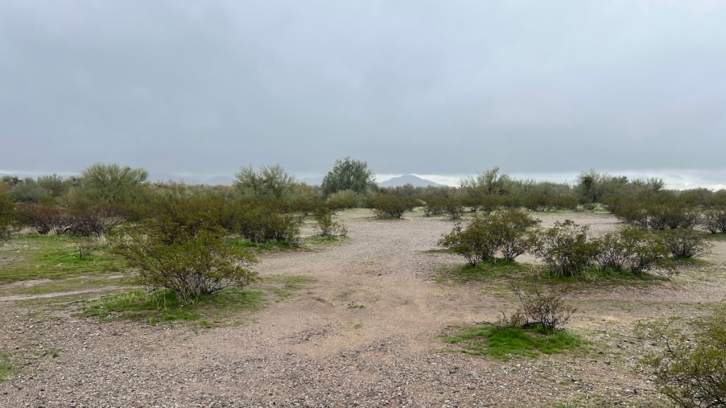 Clouds moved in during the early afternoon, and the winds intensified. Once again, we had steady 20 mph winds with the highest recorded gust of 34. Then it rained. Again. Fortunately, the ground here is quite solid, like Quartzsite, not soft like Ironwood. We’re also on high ground, and any runoff flows down to a nearby wash. I won’t get stuck here.