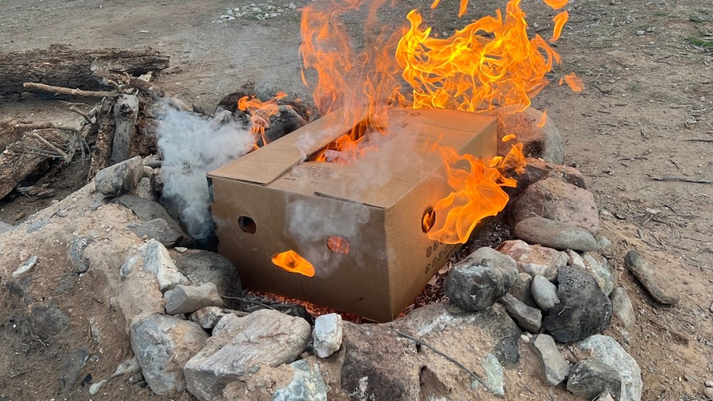 There isn’t much dry wood around for campfires after several days of rain. We did what we could because we wanted to hang out by a fire. This box didn’t seem particularly happy about it, though, based on the face it was making.