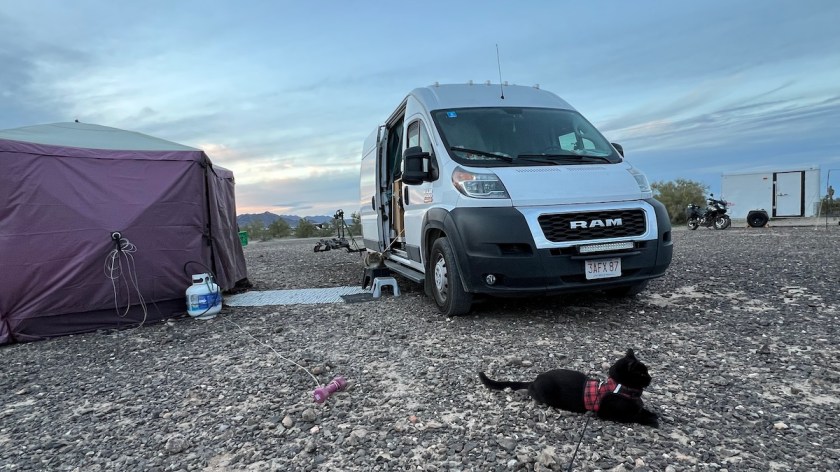 Today’s exciting adventure is taking the van into town to do laundry, one of the few tasks I can’t accomplish on my motorcycle. I’ll pick up those screws, a few groceries, and a few other things while I’m in town. It makes sense to get these done while I’m close to town since I plan to head back to Imperial Dam on Sunday, as long as the roof vent installation goes well. Quartzsite is fine, but the warmer temperatures mean it’s warm enough to go kayaking, and I want to explore the various bodies of water down there by kayak instead of only by land. There’s also the Desert Ratt Pack to hang out with, both on the radio and at campfires.