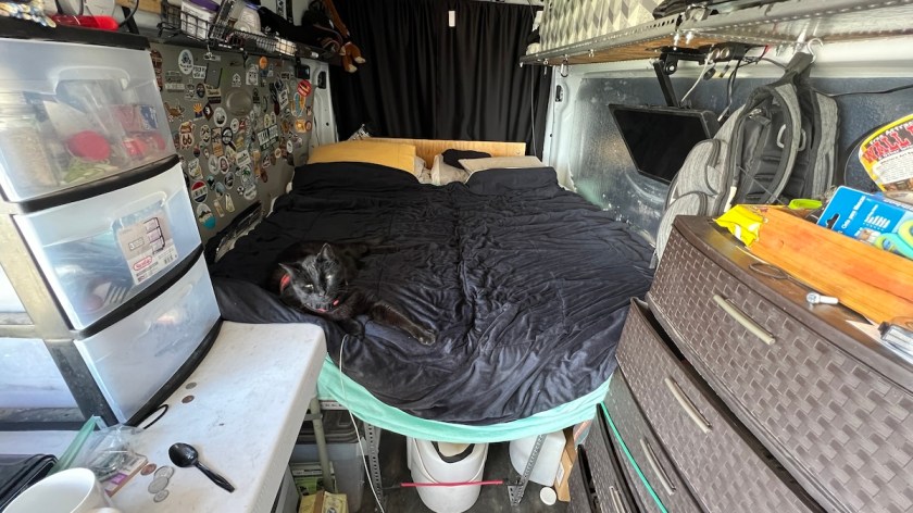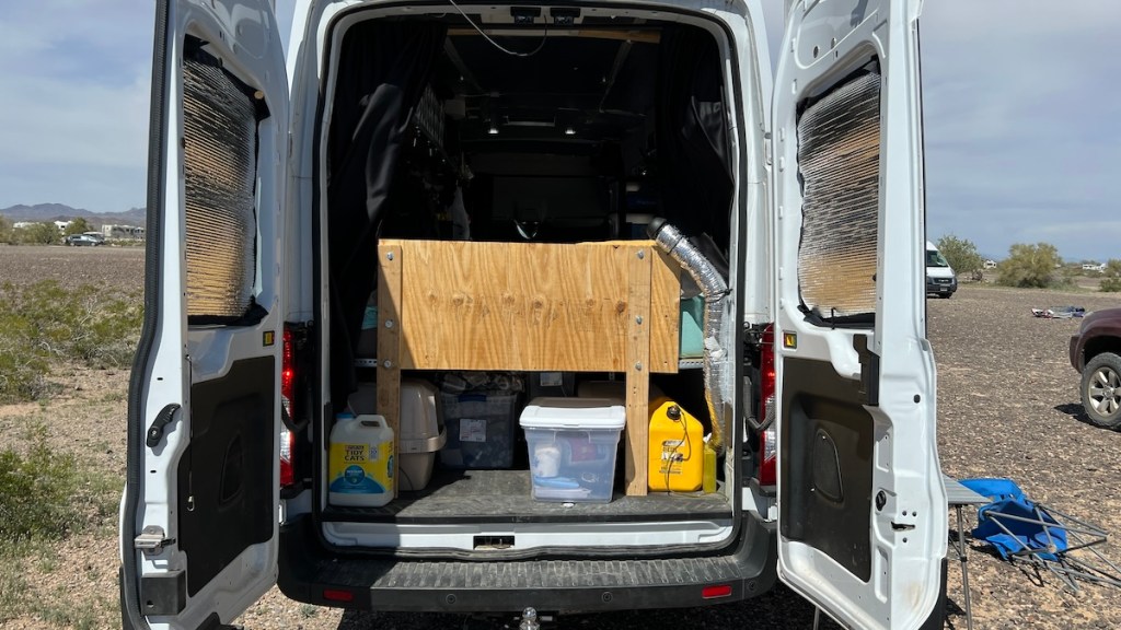 I got some fold-up boxes to sit on the shelf above one side of the bed to hold most of my clothes. Off-season clothes and bedding now go into storage bins under the bed. The toilet had to move from its old location in the back corner. The bed is just barely high enough for it to slide underneath. When I (rarely) need to use it, I can pull it out from under the bed, do my business, and slide it back out of sight. I’ll probably add a short curtain to the front edge of the bed to hide it when I’m not using it.