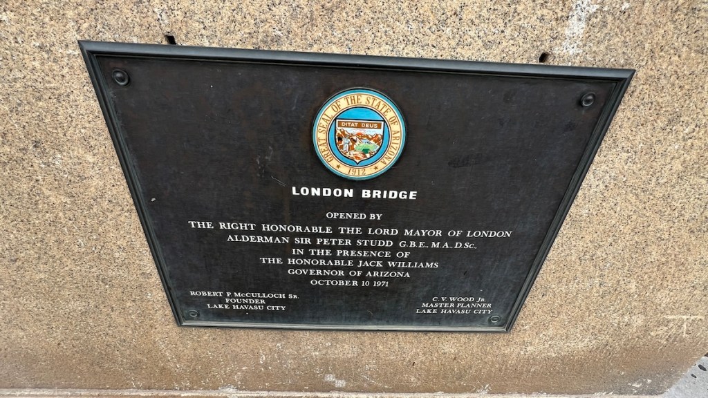 Meanwhile, in London, England, the London Bridge built in 1831 could no longer keep up with modern traffic demands, and was put up for sale. McCulloch bought it, brought the original outward-facing stones to Lake Havasu City, built a modern concrete bridge, and then used the stones from the original London Bridge to recreate it in the middle of the Arizona desert. Even the light fixtures are original, though updated with modern electric lighting. Opening in 1971, this is the centerpiece of Lake Havasu City’s tourist and shopping district and was our first stop.