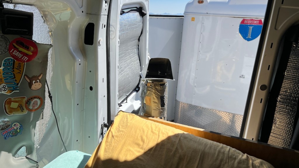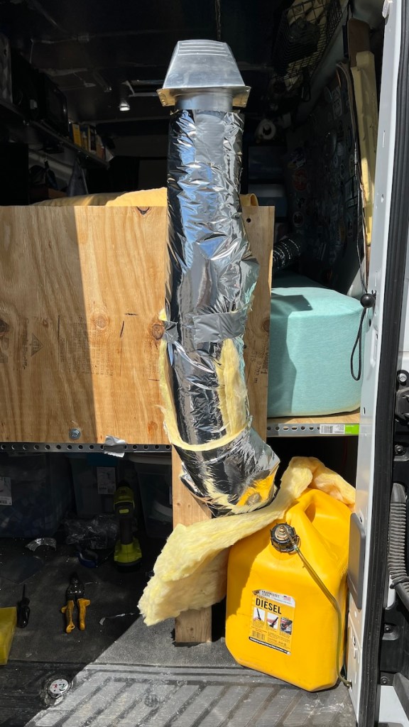 The outlet is actually a dryer vent intended to fit into the side of a house and blow downward. I’m using it vertically in order to blow hot air forward into the rest of the van. It’s high enough to blow over any pillows or other bedding so they don’t obstruct the opening and get too hot. I’m going to be in bed for cold overnight temperatures anyway, so this should put the heat exactly where I want it. It does touch the curtain on that side, so when I use the heater, I’ll have to move that curtain out of the way to avoid problems.