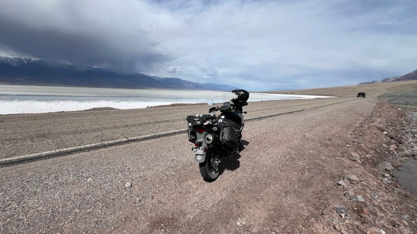 Last weekend I took a motorcycle ride through Death Valley. I’d been here before, but this visit was rather unique. Thanks to the massive rainfall that flooded out Death Valley the last time I was here and closed the park down entirely, the ancient Lake Manly has temporarily reformed in Badwater Basin. Wonderhussy, among others, even went kayaking in Death Valley just because she could. That looked like too much work, so I’d be satisfied with a good look and dipping my toes in this once-in-a-lifetime experience.
