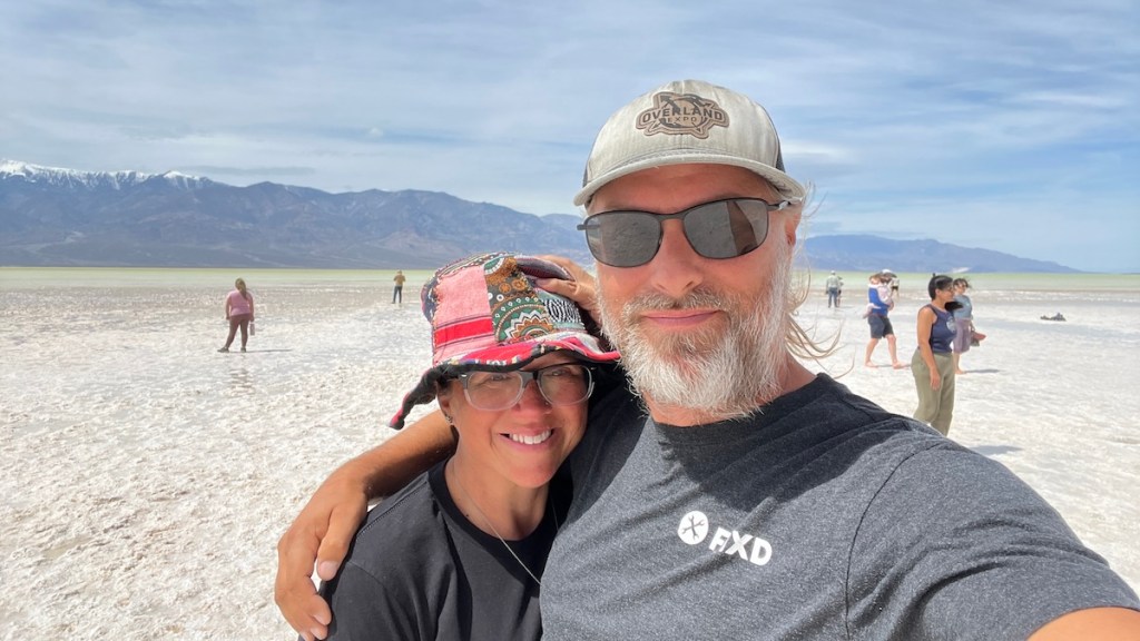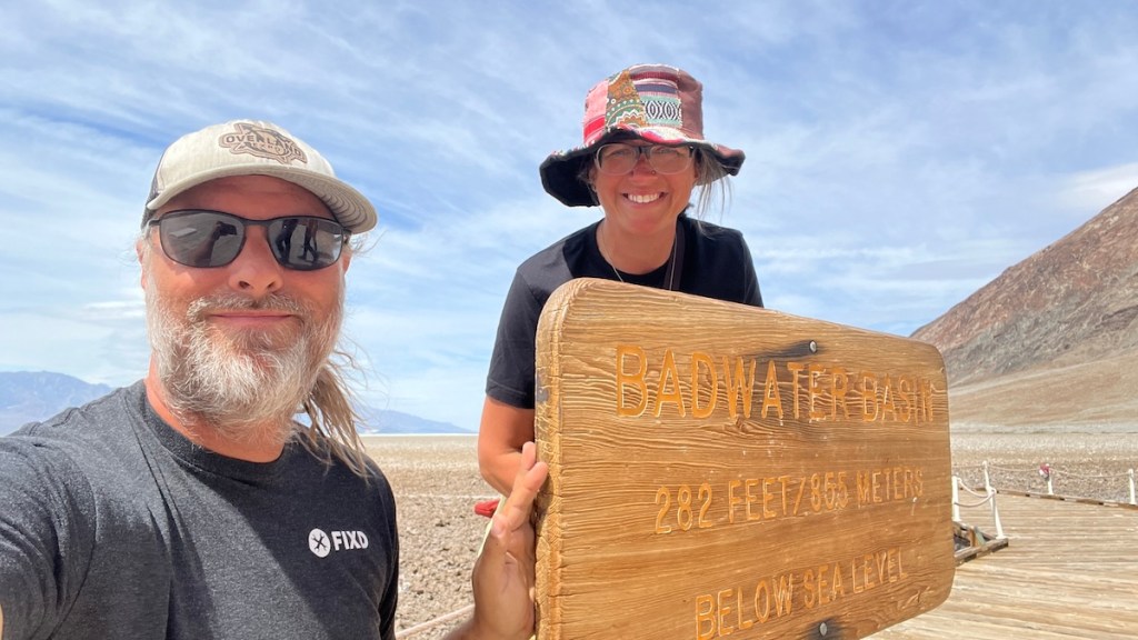 After checking out the visitor’s center and getting our parking pass (free because of our America the Beautiful passes), we drove straight to Badwater Basin so Melissa could see the ancient Lake Manly, temporarily reformed but drying up fast. It had only been a week since I visited on my motorcycle ride, yet I could tell it had shrunk quite a bit. As the weather keeps warming up, it will shrink faster until it’s gone.