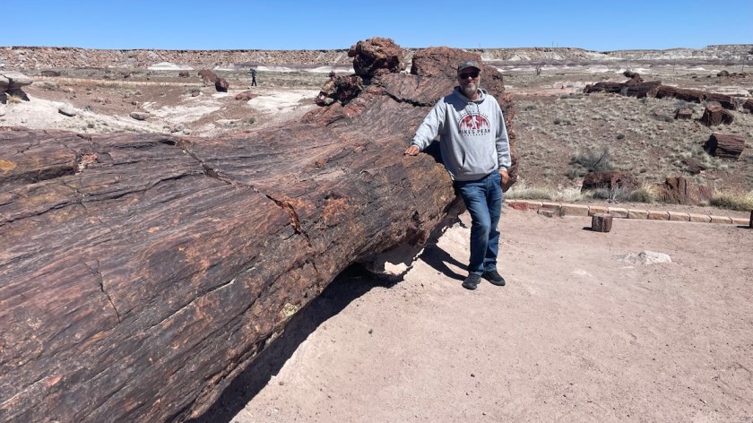 We took a quick walk on some trails behind the visitor’s center and saw some enormous petrified logs. Check out this one with me for scale. At its base, it’s thicker than I am tall! I’ll never get over how much it looks like wood, but when you touch it, you can feel that it’s cold like a rock because it is a rock now. No words can convey this feeling, so you’ll just have to go touch some petrified wood yourself some time.