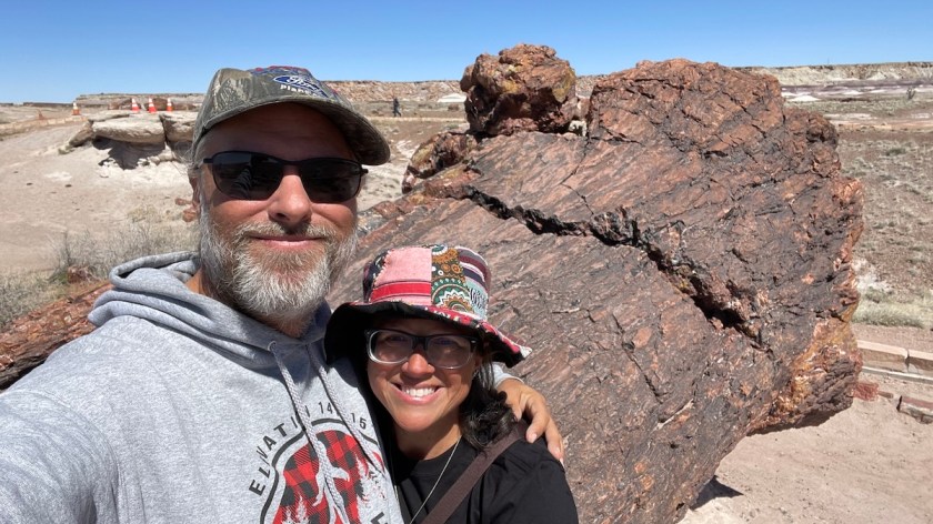 We took a quick walk on some trails behind the visitor’s center and saw some enormous petrified logs. Check out this one with me for scale. At its base, it’s thicker than I am tall! I’ll never get over how much it looks like wood, but when you touch it, you can feel that it’s cold like a rock because it is a rock now. No words can convey this feeling, so you’ll just have to go touch some petrified wood yourself some time.