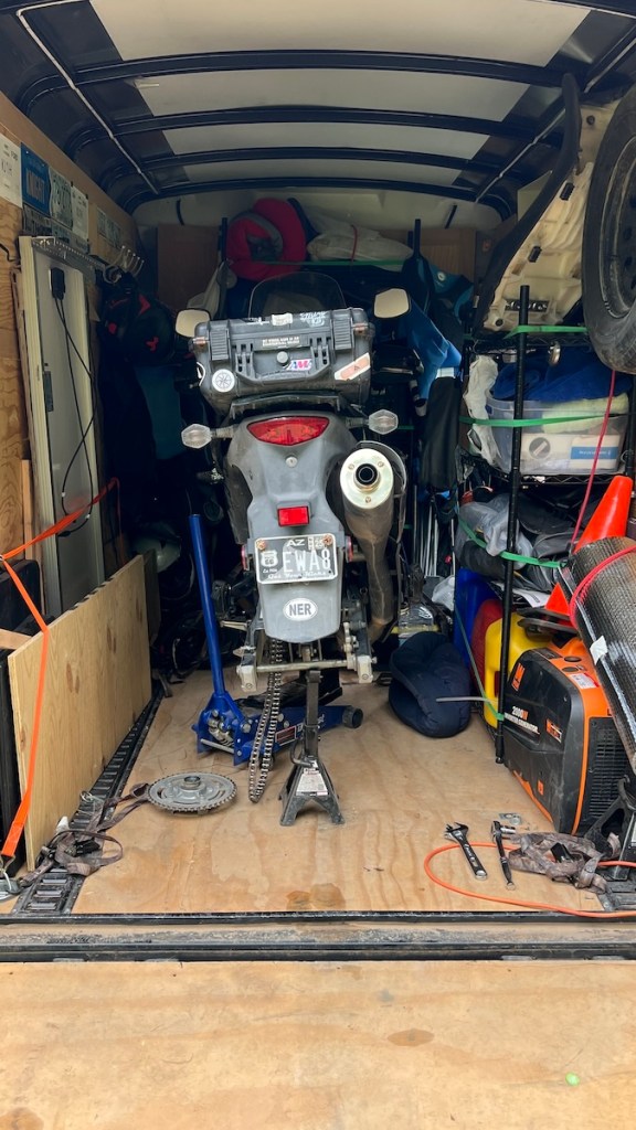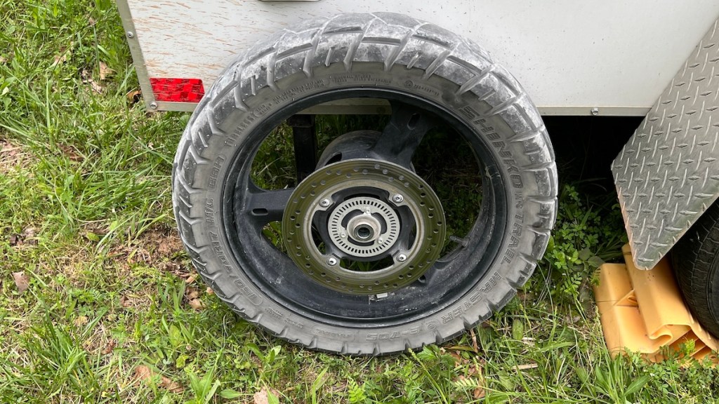 Seeing all the bikes made me a little bit sad to not be on mine. However, my replacement motorcycle tire just arrived at the nearby Cycle Gear. The weather has cooled off a bit, so I was able to remove the back wheel without sweating up a storm (though it’s nice having access to a shower anytime I need it). The bike was still strapped down from the trip east, so I released the rear straps, then used my floor jack to raise the back of the bike off the ground, pivoting on the front wheel and using the two front straps to hold the bike upright. It worked much better than I expected. I slid the axle back into place and put a jack stand under it for safety.