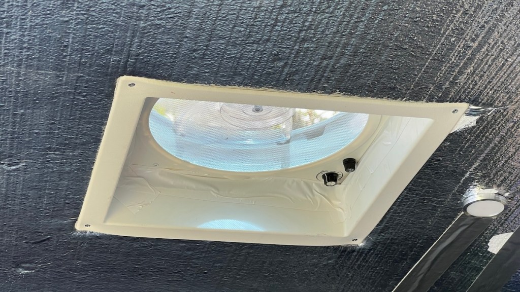 I also finally installed the trim piece for my front roof vent. I’m not happy with how it came out. I measured twice, cut once, and ended up half an inch short, leaving an ugly gap between the trim and the fan. For now, I’ve filled that gap with white tape, so it’s a little bit less ugly.