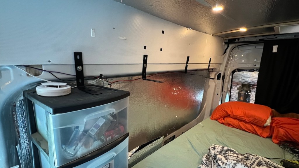 While my previous angle iron design is functional, it isn’t aesthetically pleasing. I also got sticker shock from the price of the angle iron when I rebuilt the bed, so this time we did something different. I bolted L-brackets into the pre-threaded mounting points on the wall, then used some scrap plywood I remembered moving out of her storage unit as the shelf. I let her pick the colors and paint it herself, and then she helped me install it in the van. I added a couple of diagonal supports as well, which was my uncle’s redneck engineering solution on the original shelves on the driver’s side. The plastic drawers are screwed into the shelf with small L-brackets, while painted pieces of quarter-round prevent her totes from sliding off the shelf while we drive. At least, that’s the theory. I haven’t actually driven anywhere yet to test this, but we will be today.