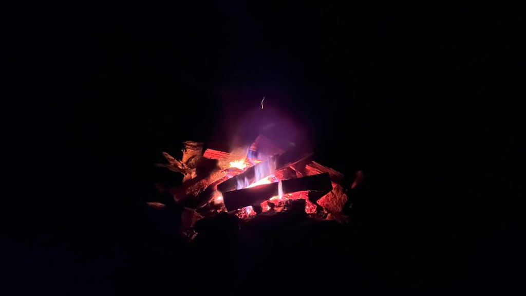 Melissa got particularly persistent Saturday night, gathering whatever twigs and branches she could find on the ground in the surrounding area to try to get it burning. Even though these had been outside through the recent rain, they still ignited, unlike the firewood we’d paid money for. She got a good fire going with scavenged wood, but even then, the wood we bought would not ignite under any circumstances.