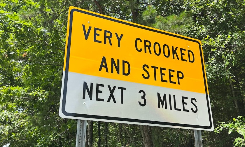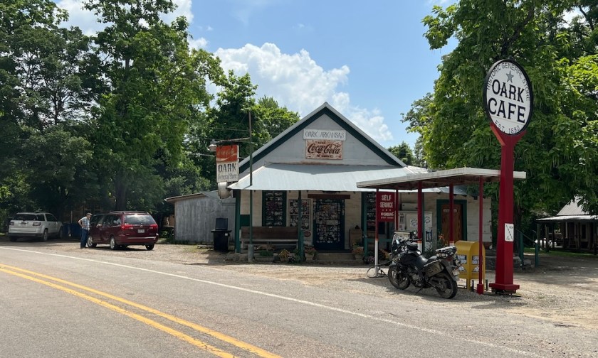 It’s time for the weekly check-in. I went on a spontaneous bike ride the other day. I was working on an article for ADVRider about motorcycling in the Ozarks of Arkansas and decided that I needed a picture of this sign. There are many like it in the area, usually right before a series of hairpin turns. In all my travels, I’ve never seen this particular sign except here in Arkansas, so I wanted a picture of one to go with the article. I rode most of the way down the Pig Trail to find one, but I got the shot. Soon afterward, I recognized the turn onto Route 215 and decided to hit the Oark Cafe for lunch and another photo opportunity. I finished the article when I got back, and will share a link to it once it’s posted.