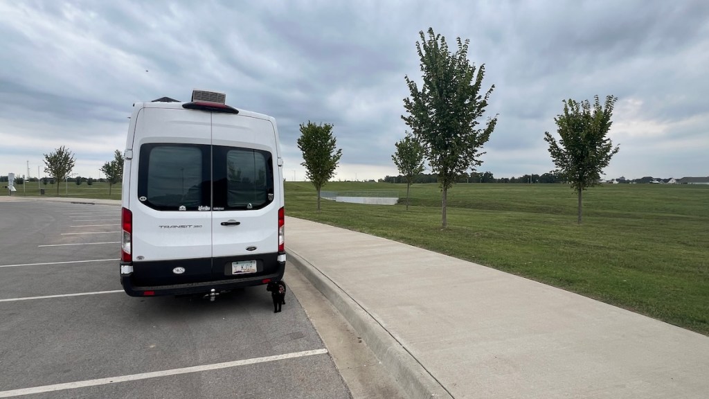 Our trip actually started early Friday morning. Melissa had to work, and then only had a two-hour break before the classroom portion of the class, so there was no time to drive home and go back. Plus, after class let out at 9 PM, she had to be back before 8 AM to get on the bike and ride. The hour-plus drive each way would’ve made her too tired, so it made sense to take the van and urban boondock in Rogers for the weekend. We made as many preparations for warp speed as possible Thursday night, and then I drove her to work in Springdale early Friday morning. After that, I got coffee, an oil change I was due for, and found a nice park to hang out in for a while and got some work done.