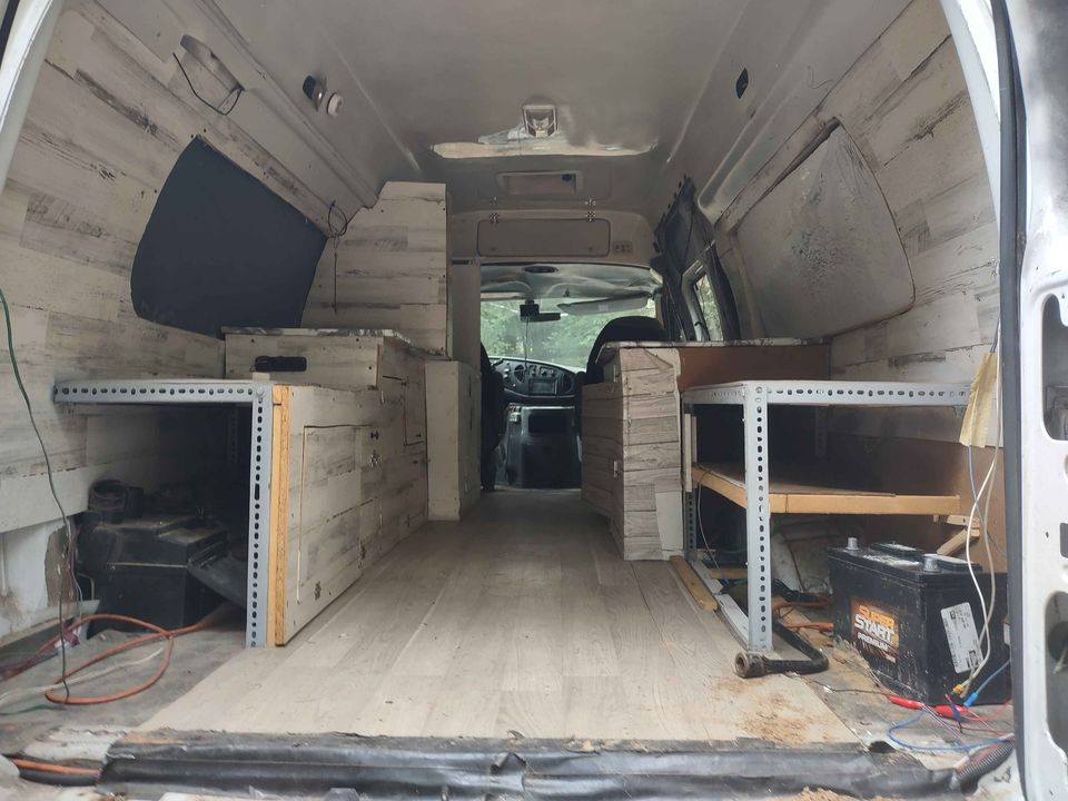 It’s been completely torn out and redone! The side windows have been covered up. An RV interior light has been added to the roof. Some of the old angle iron frame still exists. It looks like the center of the old bed frame got cut to create a pass-through instead. Most of the cabinets and their associated framework have been removed. The potential buyer told me none of the electrical stuff works, including both Maxxair fans. This tells me that my original wiring probably got torn out when the interior was redone and not replaced.