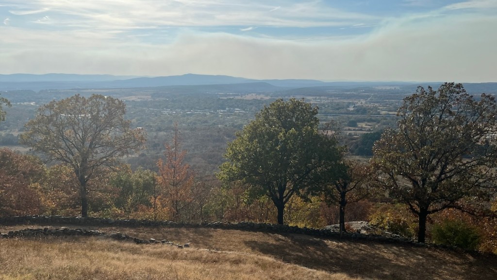 We also took a drive to the top of the parking lot to see the view of the town of Heavener from the overlook. It was a beautiful fall day, and fairly warm, though a bit windy. We could have explored the park more, but this was just a quick stop in the middle of an all-day 500-mile drive. Maybe we’ll explore a bit more some other time or even camp there at some point.