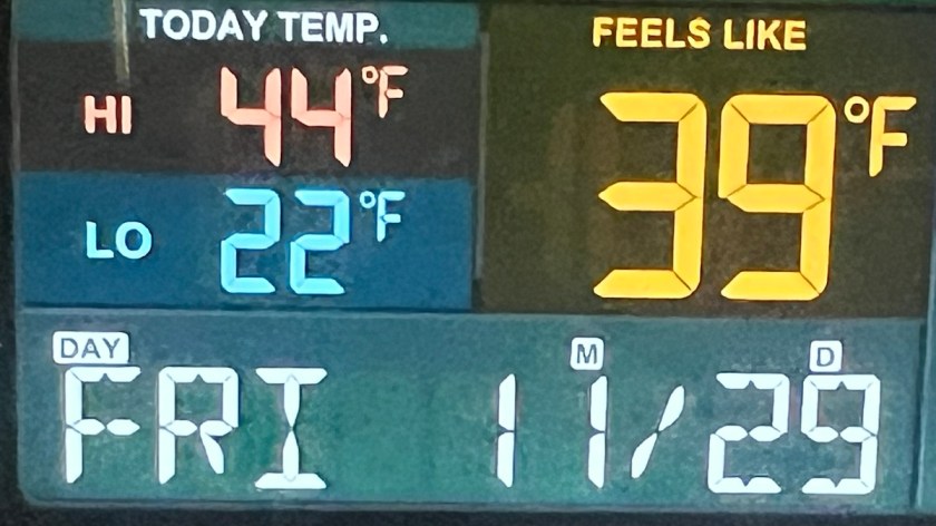 We got lucky last night and the furnace did kick on multiple times. I was very surprised. Tonight’s low is 25°. We’ll see if I get lucky again or if I have to get up and power cycle it. And straighten my three blankets.