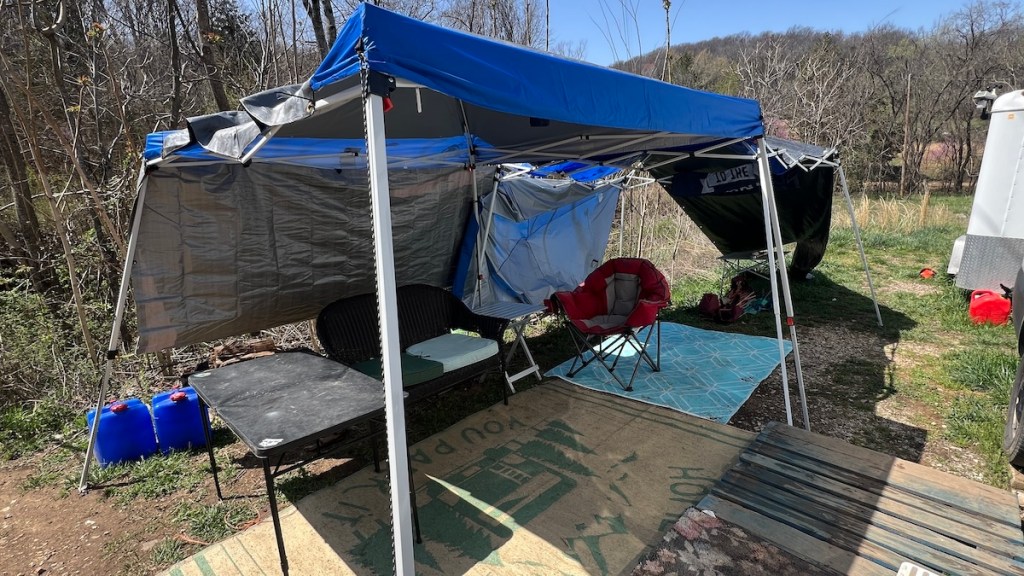 As the weather started to warm up, we set up Melissa’s pop-up canopy next to the van. It’s several years old, and after a while, the nylon top ripped, rendering it useless. I bought a replacement top for it, only to find it absolutely did not fit. It appeared to be for a completely different design. So for just $10 more than the flimsy piece of nylon, we bought an entirely new pop-up canopy. Indeed, it was a completely different design than her old one, even though it was still an Ozark Trail 10×10 popup “just like” her old one. Admittedly, the new one is a much better design. But there was no indication on the top that cost almost as much as the whole kit ‘n’ caboodle that it wouldn’t work with the older frame, which was still in perfectly good shape. But at least we had a pop-up and a shaded area that expanded our living space beyond just the van itself, where we’d been cooped up all winter.