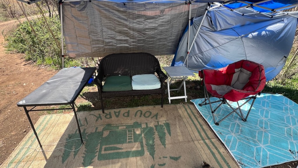 We’ve set up the front section as an outdoor living room since we don’t have anywhere for the two of us to sit comfortably together inside the van. We bought a simple outdoor loveseat bench kind of thing from Home Depot, plus two cushions. Not visible is a combination lantern, weather radio, and Bluetooth speaker I bought a while back (thanks to Matty Van Halen for recommending it). Hanging it from the pop-up frame gives us light after the sun goes down and tunes anytime we want them. We’re still using my “Home is where you park it” outdoor rug, so Melissa got to choose the second rug for the extended living space. There is plenty of room behind it for us to expand the space for family hangouts and such, and we’ve even discussed setting up my projector to watch movies on the side of the van.