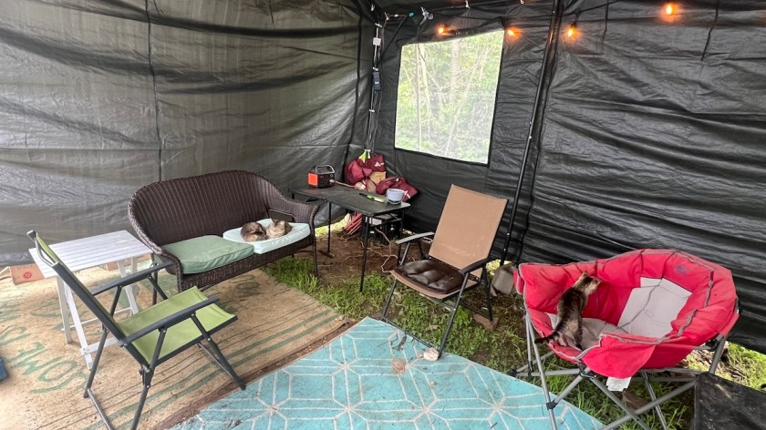 We left one of the side walls off, partly for easy access from the van and partly because the van and trailer themselves act as the fourth wall. Then we set up ALL of our seating and tables inside, as well as my propane stove/grill. I’ve moved it inside during the rainy weather we’re having right now, but normally it sits next to the van so steam and smoke rise up and don’t collect inside. After trying and failing with a set of solar lights, we got two sets of outdoor LED string lights that I put up around the bottom of the roof. We could get an adapter and extension cord and plug them into the house, but instead, I plug them into one of our power stations. Both strings draw just 15 watts, so even my little Jackery 240 will run them for days on its built-in power inverter. I’ll just recharge it during the day when I occasionally need to.