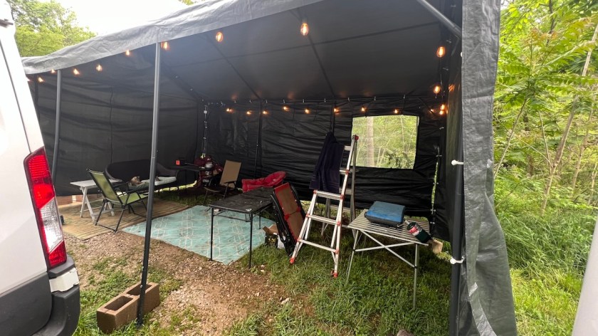 I do not recommend a carport like this for on-the-go nomad life like I used to live. It’s big, bulky, and takes a lot of work and multiple people to set up and take down. However, I’m not living that kind of life right now, and it pretty much quadruples our usable living space from just the van itself. When we take weekend trips, we’ll leave it behind, then park next to it again when we get back.