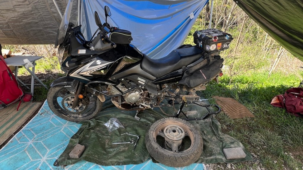 It also doubled as a garage for several maintenance jobs on my V-Strom, mainly a new back tire, chain, and sprockets. It made sense to do all of these at the same time, since the back wheel had to come off for all these jobs anyway. I also fixed a stuck rear preload adjuster, replaced my five-year-old cargo box with a new one since it was starting to crack, and installed my shiny new Arkansas license plate.