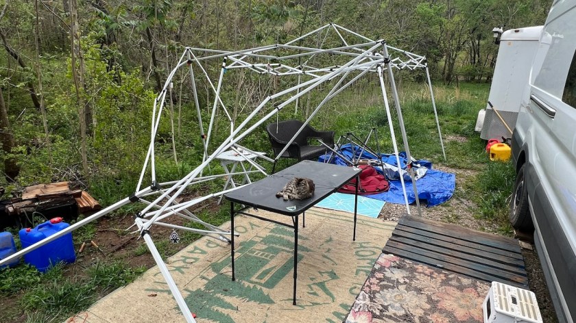Unfortunately, a heavy overnight rainstorm single-handedly caused the demise of Megatent. The weight of the water was too much for the frames, even the new one, bending and breaking both beyond repair. I salvaged all of the tarps, but the frames are nothing but scrap metal at this point.