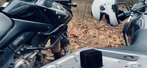 A man, a cat, a motorcycle, and a van.